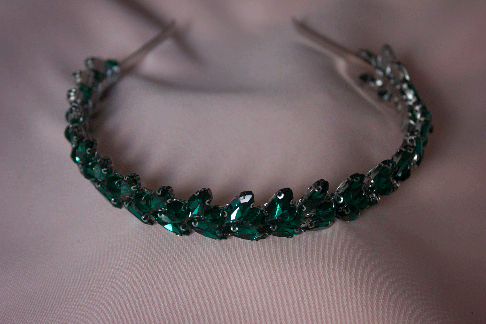 Das silberfarbene Diadem ist handwerklich gefertigt und verfügt über eine Prinzessinnenschleife, die Ihre Frisur mit wunderschönen grünen Steinen umrahmt. Die Steine fangen das Licht auf bezaubernde Weise ein und erzeugen einen Glanz, der perfekt zum Zauber Ihres besonderen Tages passt.