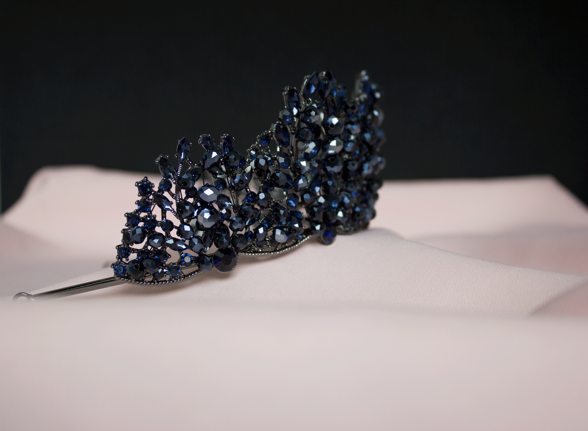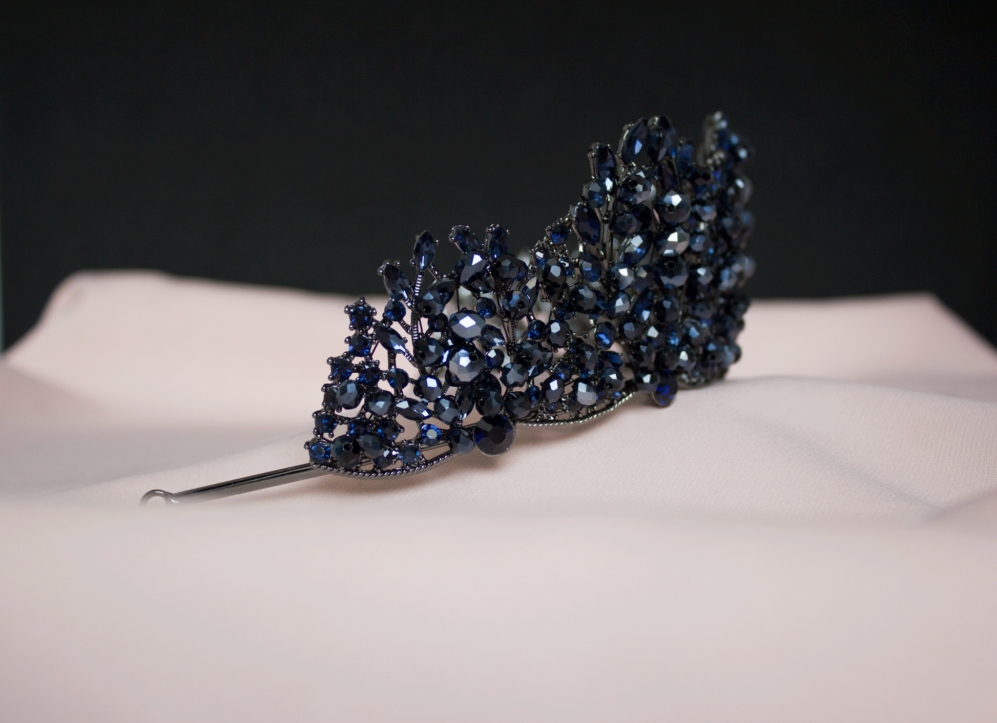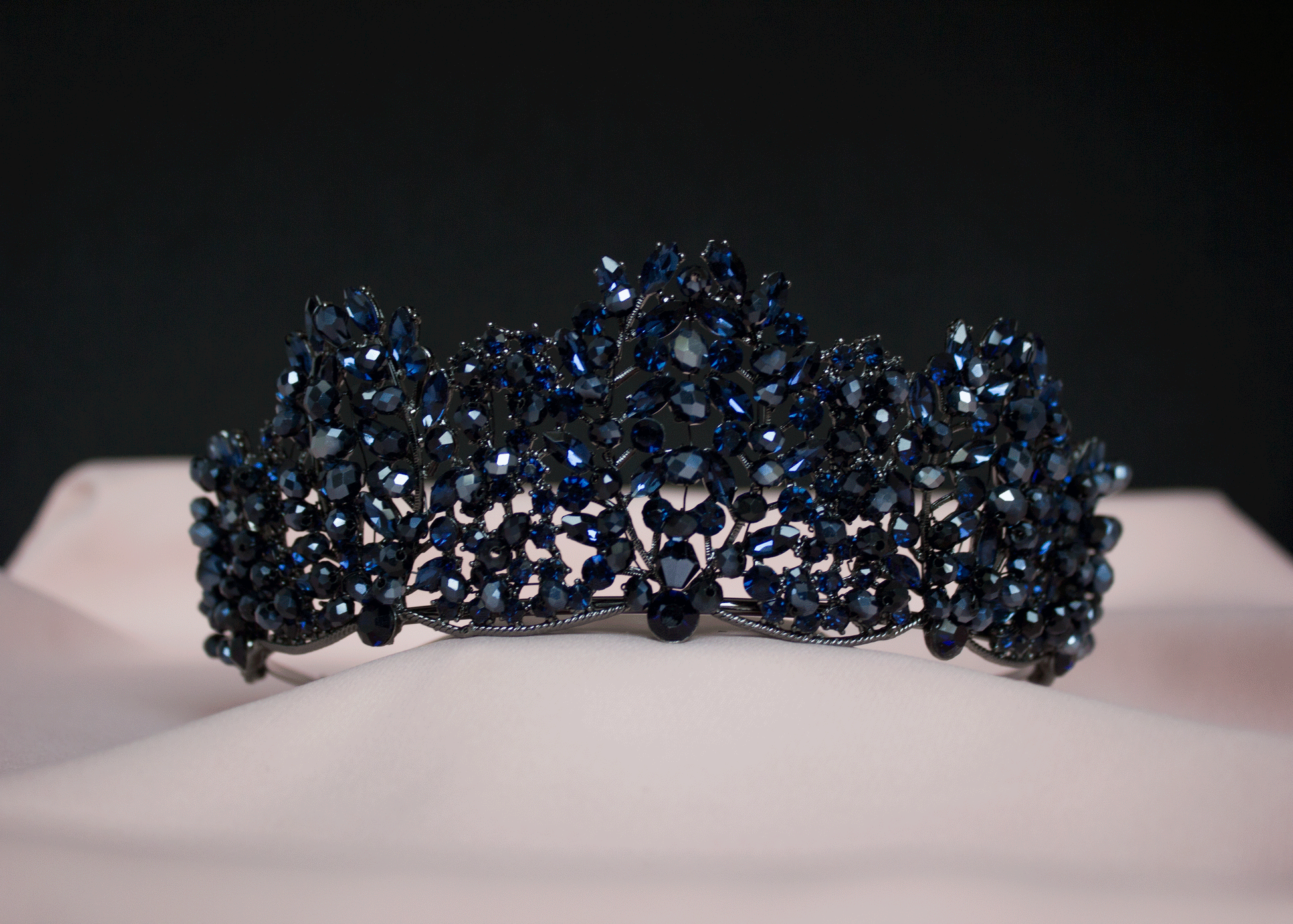 Wunderschöne dunkelblaue Tiara, verziert mit blauen Perlen und Kristallen, ein wunderschöner, atemberaubender Haarschmuck für Ihren Großen.