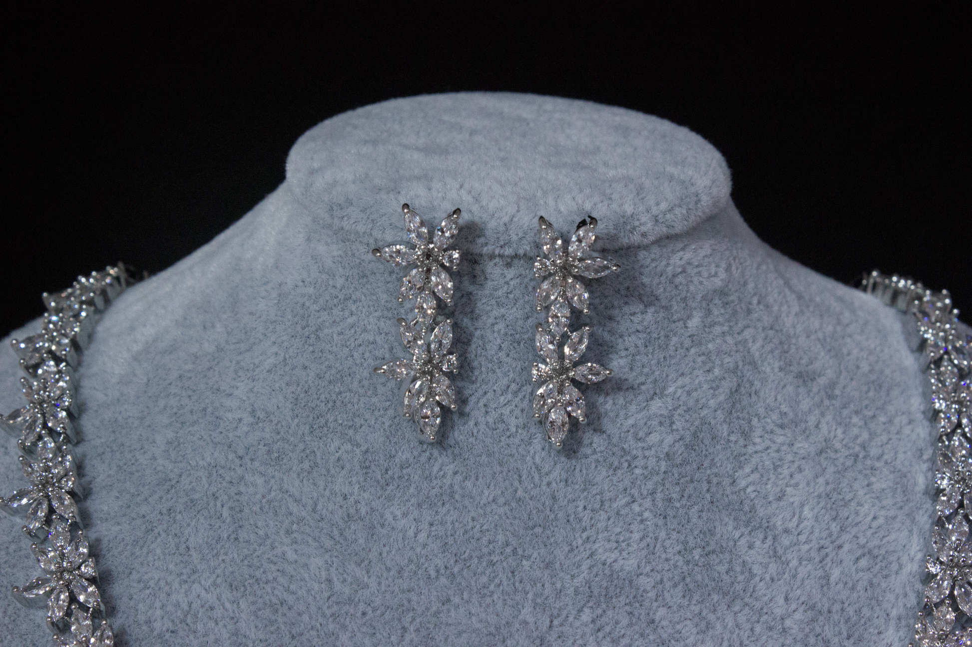 Entdecken Sie unser exquisites Silberschmuckset, in dem ein bezauberndes Blumenmotiv und wunderschöne Zirkoniasteine zusammenkommen. Bereichern Sie Ihren Brautlook mit zeitloser Eleganz. Bestellen Sie noch heute diese unwiderstehlichen Accessoires und glänzen Sie an Ihrem besonderen Tag.