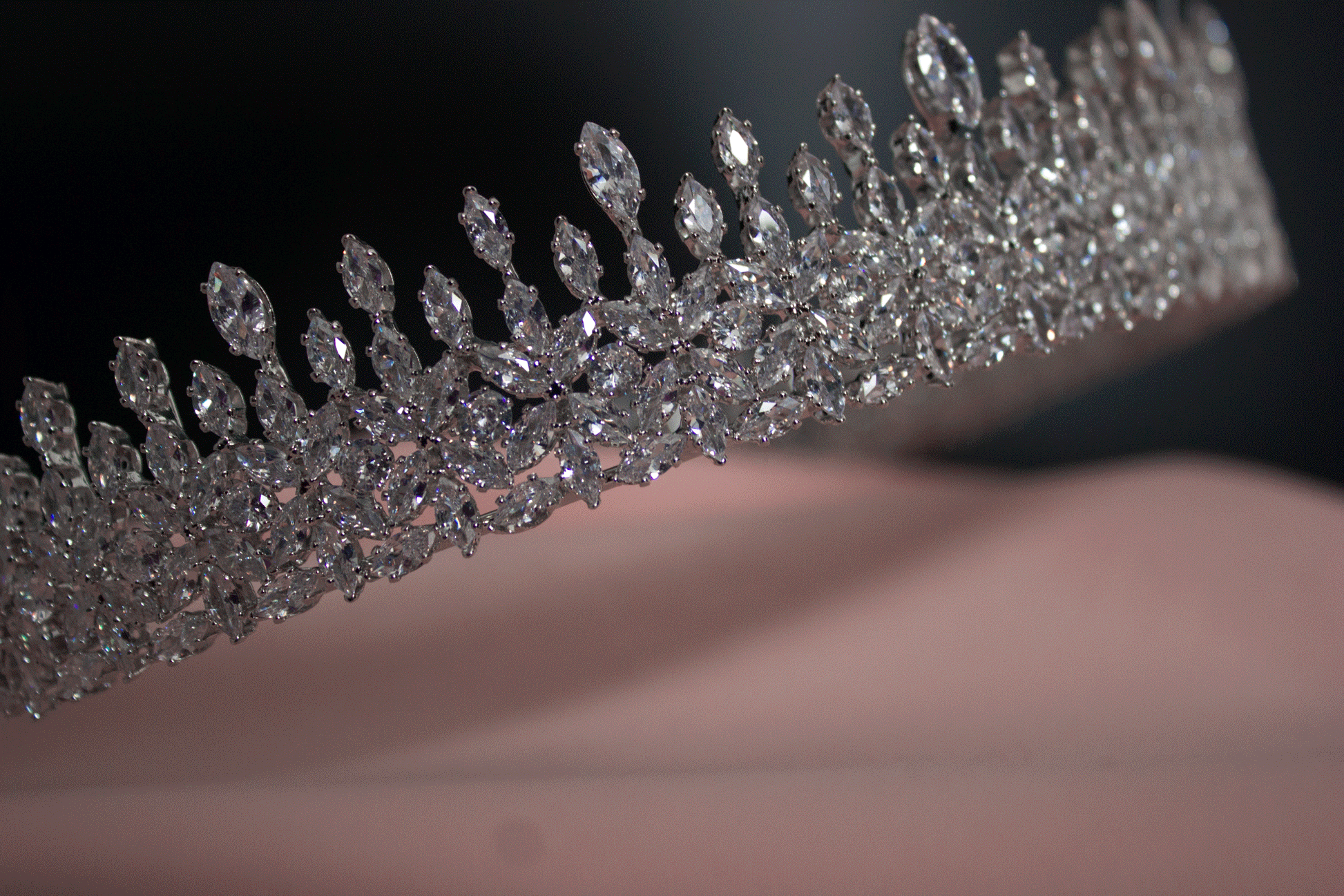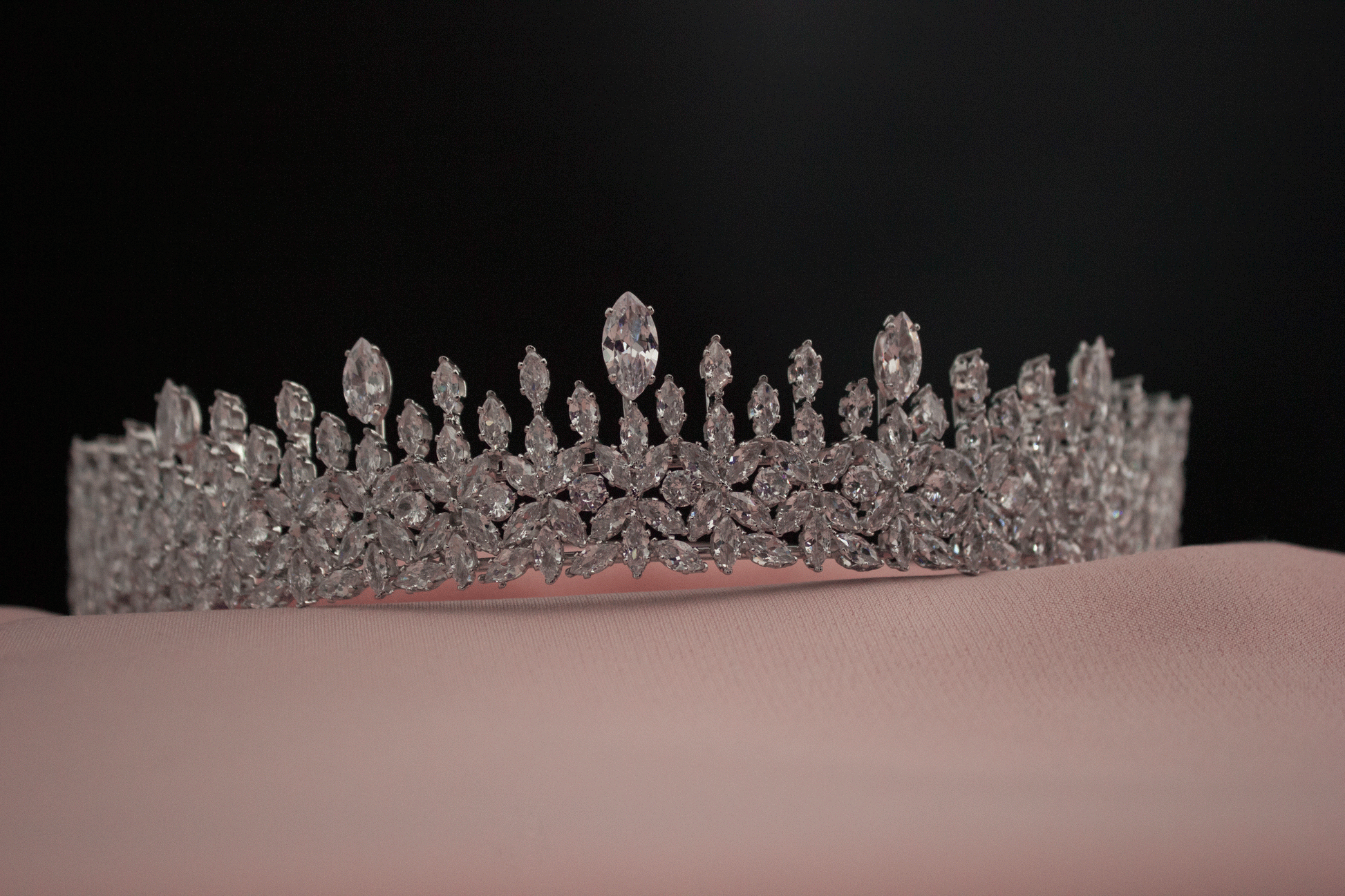 „Bridget“, komplett mit Zirkonia-Steinen verziert, die einen wunderschönen Glanz verleihen, der Ihnen sofort ein luxuriöses Gefühl vermittelt. Was Bridget von einer Standardkrone unterscheidet, ist, dass Bridget einer der wenigen Haarschmuck ist, der vollständig bis zum Ende bearbeitet ist. Diese Art der Vollkreisverarbeitung vermittelt Ihnen ein königliches Gefühl.