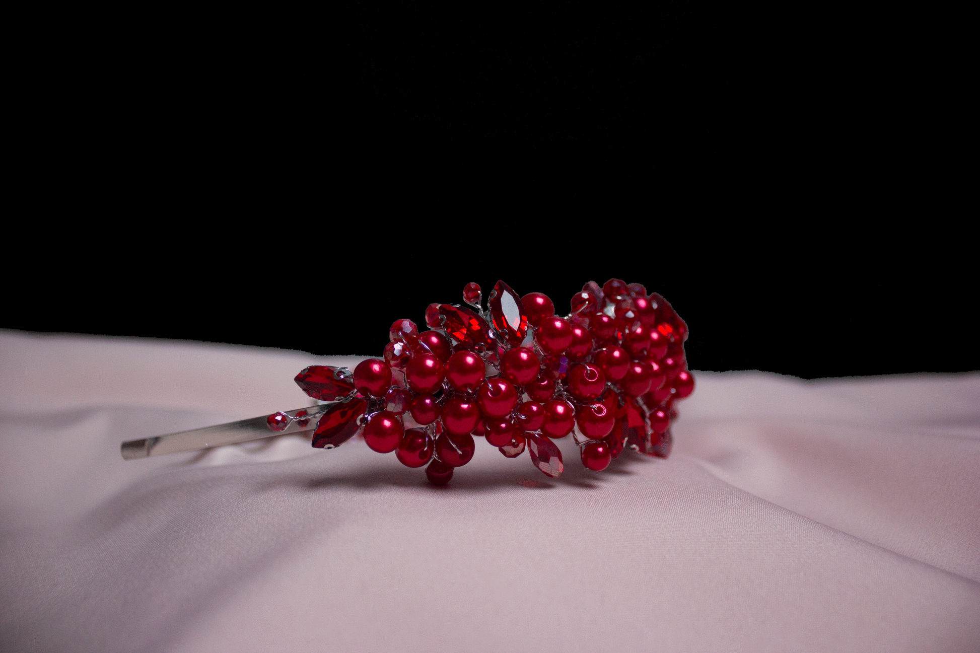 Das Stirnband „Danae“ in der Farbe Rot ist komplett handgefertigt und besteht aus hellblauen Perlen und Diamantsteinen.