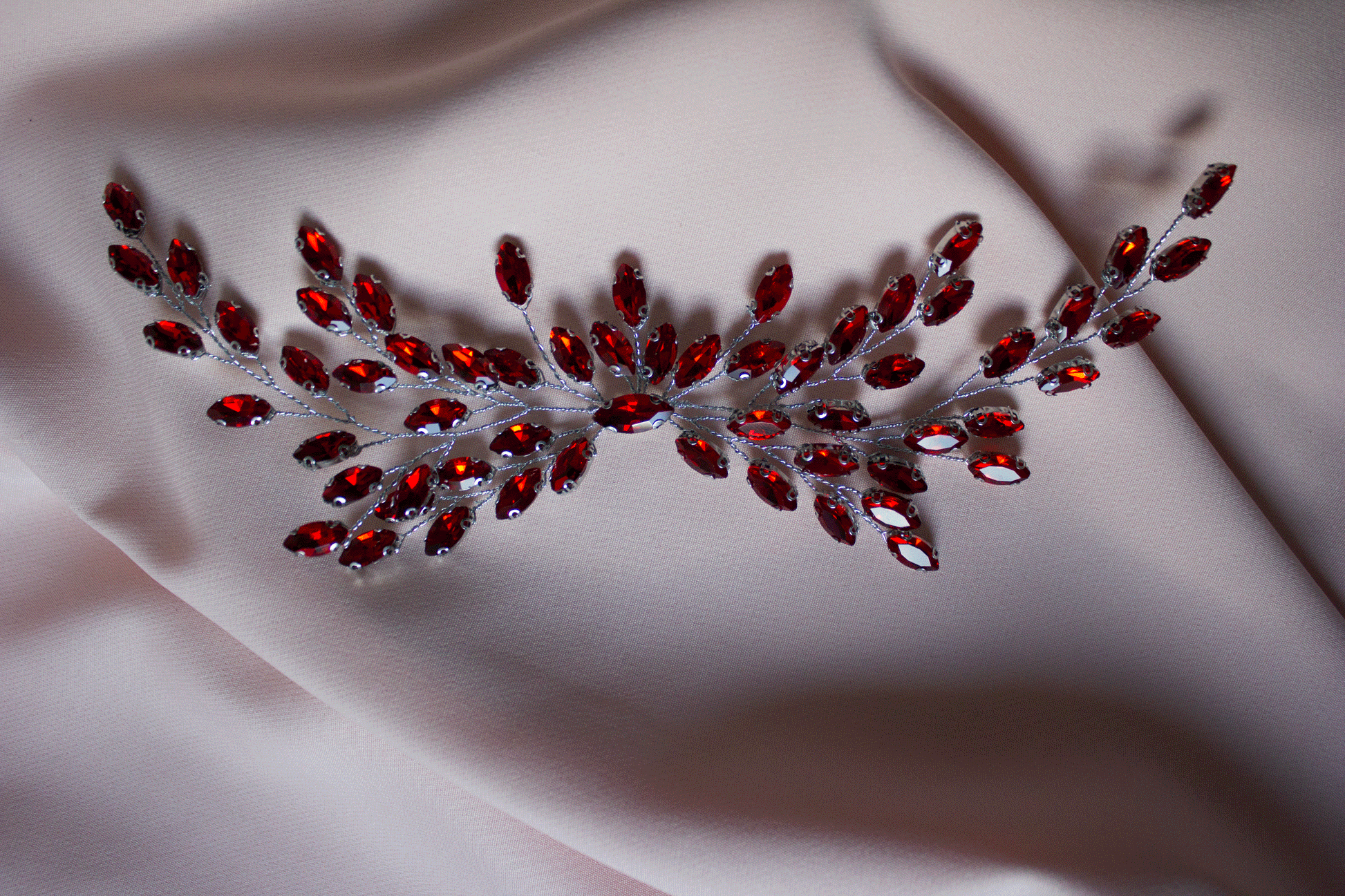 Die Haarranke wurde sorgfältig und mit viel Liebe zum Detail entworfen. Entlang des flexiblen Drahts sind von Hand zarte rote Kristalle angebracht, die Ihnen endlose Möglichkeiten bieten, ihn auf unterschiedliche Weise im Haar zu tragen. Wickeln Sie es um eine romantische Hochsteckfrisur für einen raffinierten Look, tragen Sie es für einen königlichen Touch oder lassen Sie es dezent durch lockere Wellen schlängeln, um ein Bohème-Flair zu erzielen.