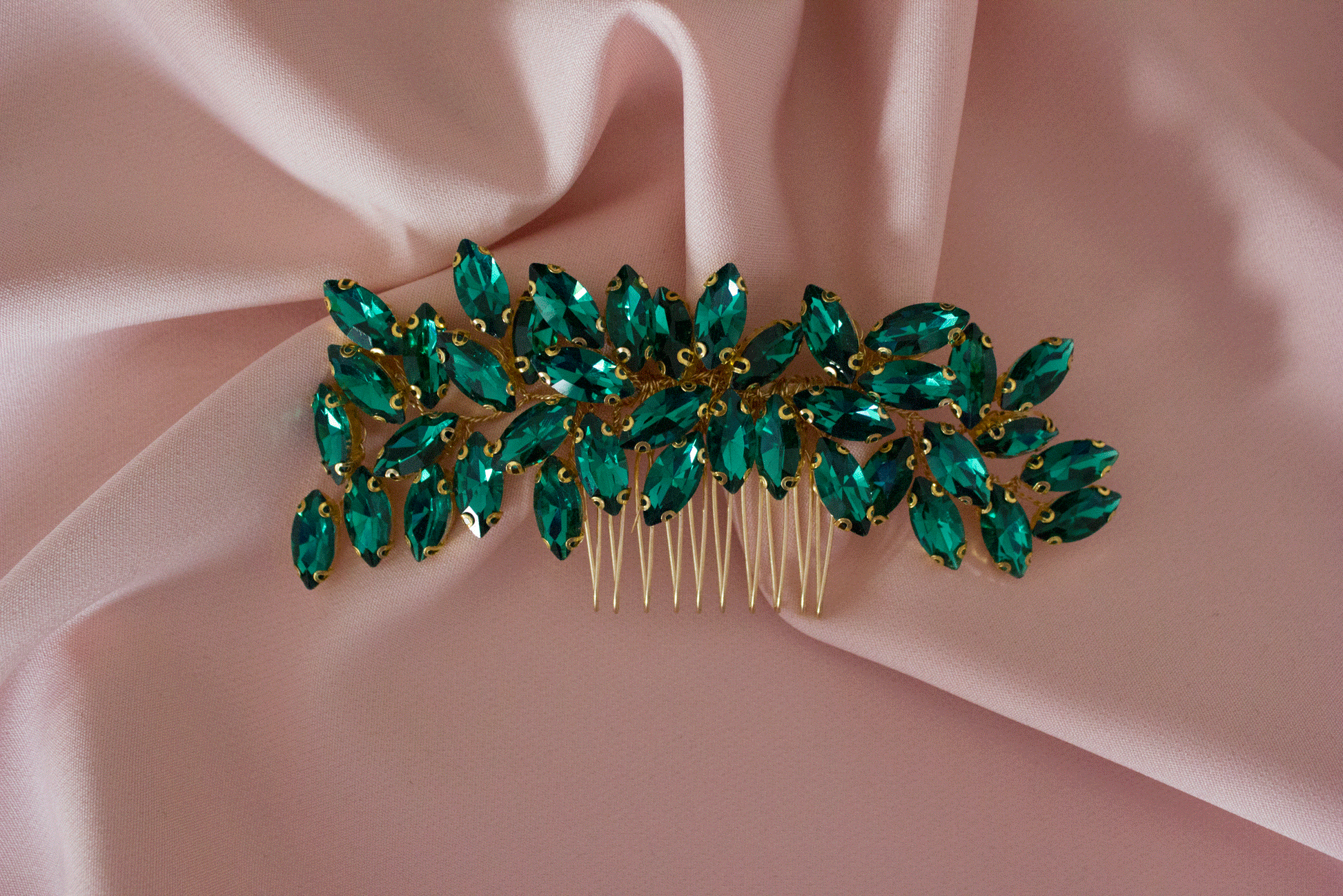 Entdecken Sie unseren wunderschönen grünen Haarkamm, ein perfektes Accessoire, um Ihrer Hochzeitsfrisur einen Hauch von Leidenschaft und Eleganz zu verleihen. Schauen Sie sich unser einzigartiges Design an, verziert mit funkelnden Details für einen unvergesslichen Hochzeitstag. Besonders gut eignet sich dieser Haarschmuck für eine halbseitig lockere Frisur, bei der Sie den Haarschmuck seitlich am Kopf tragen können.