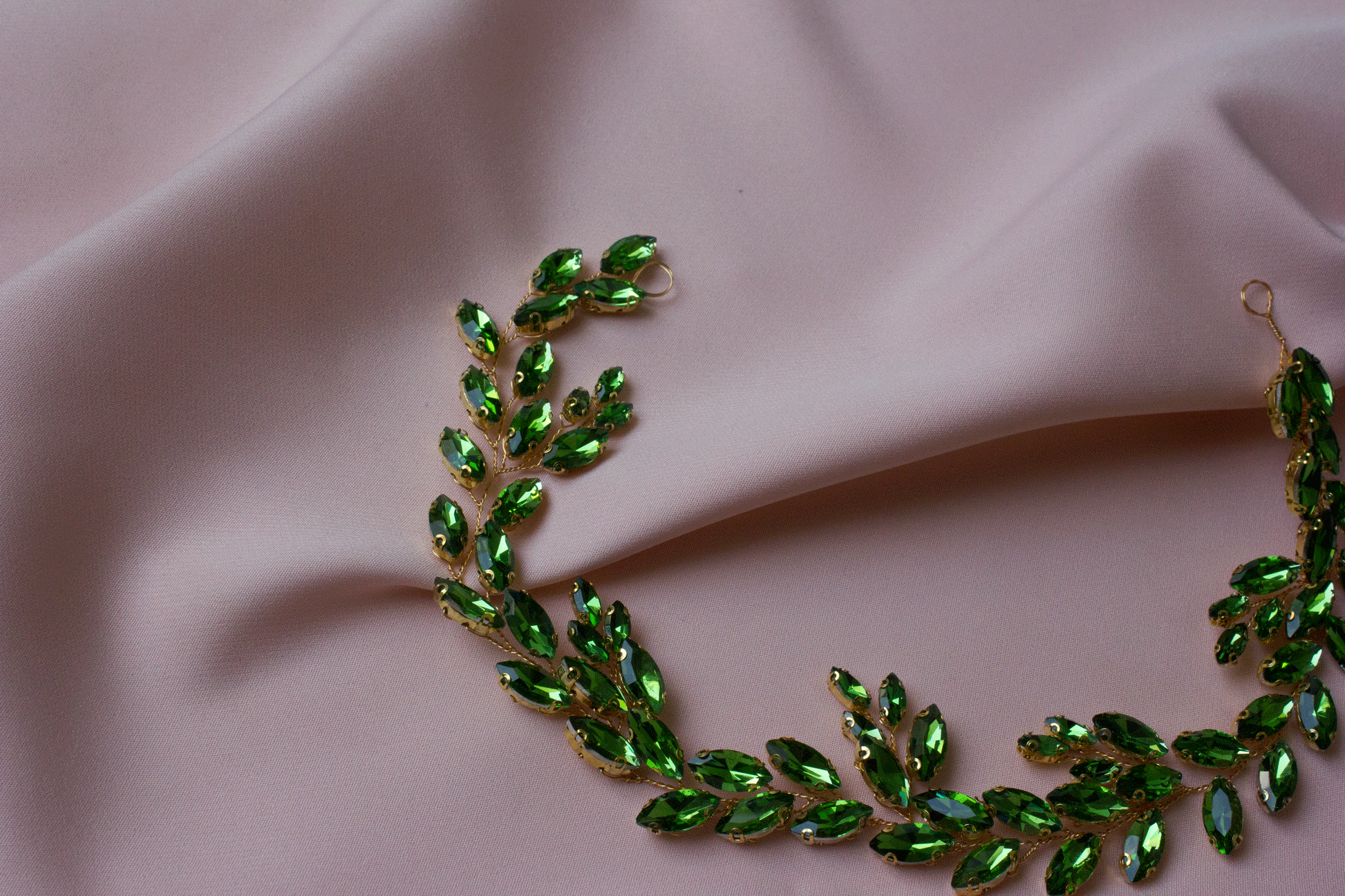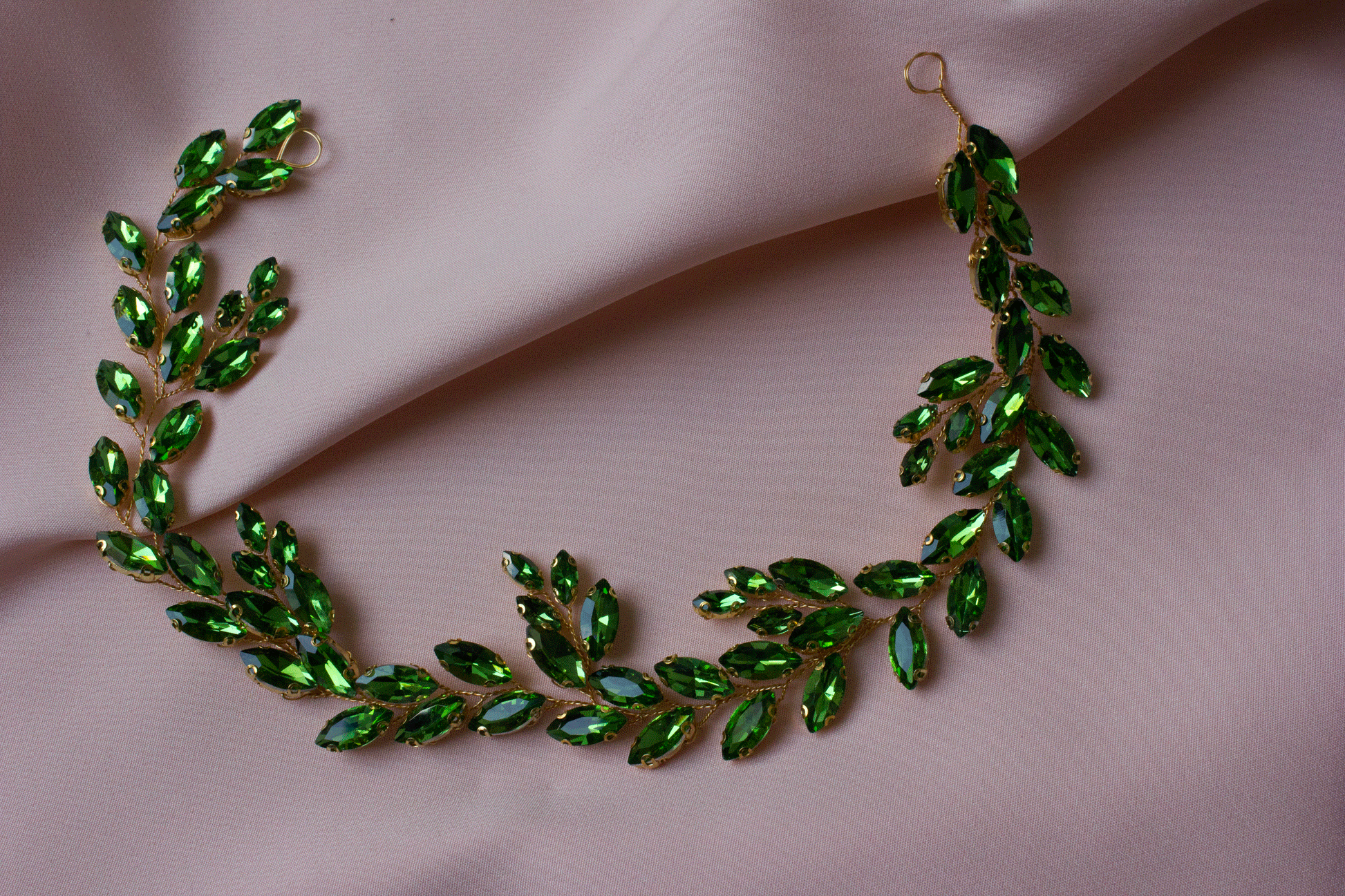 Diese Haarranke ist voller Romantik und hat ein goldenes Finish, das perfekt mit dem tiefen, leidenschaftlichen Rotton harmoniert. Die Länge von 37 cm bietet Vielseitigkeit beim Styling, während die funkelnden grünen Steine dem Ganzen einen bezaubernden Glanz verleihen.