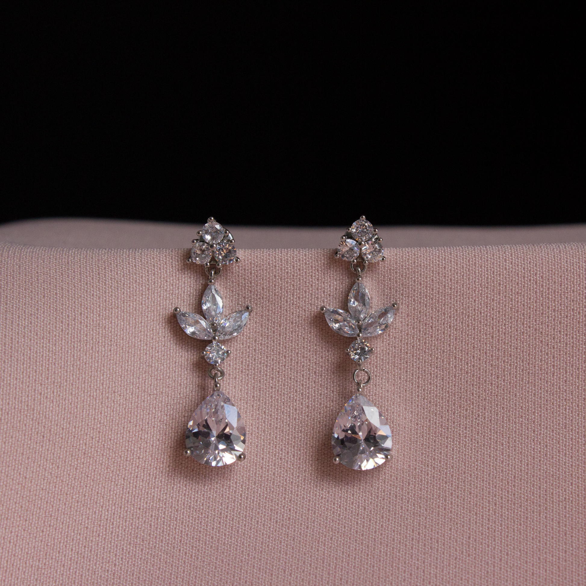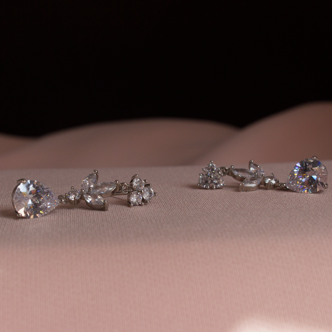 Nisa, stijlvolle doch elegante oorbellen die met minimalisme er toch voor zorgt dat de oorbellen een eye catcher zijn. Voor deze oorbellen is gebruik gemaakt van verschillende vormen van zirconia stenen die samen in harmonie een mooi geheel vormen. Deze oorbellen hebben een druppelvormig hangend gedeelte dat elegant aan de oren hangt. De eenvoudige, doch sierlijke vorm maakt ze geschikt voor zowel dagelijkse als formele gelegenheden zoals bijvoorbeeld voor je trouwdag als elegante trouw accessoires.