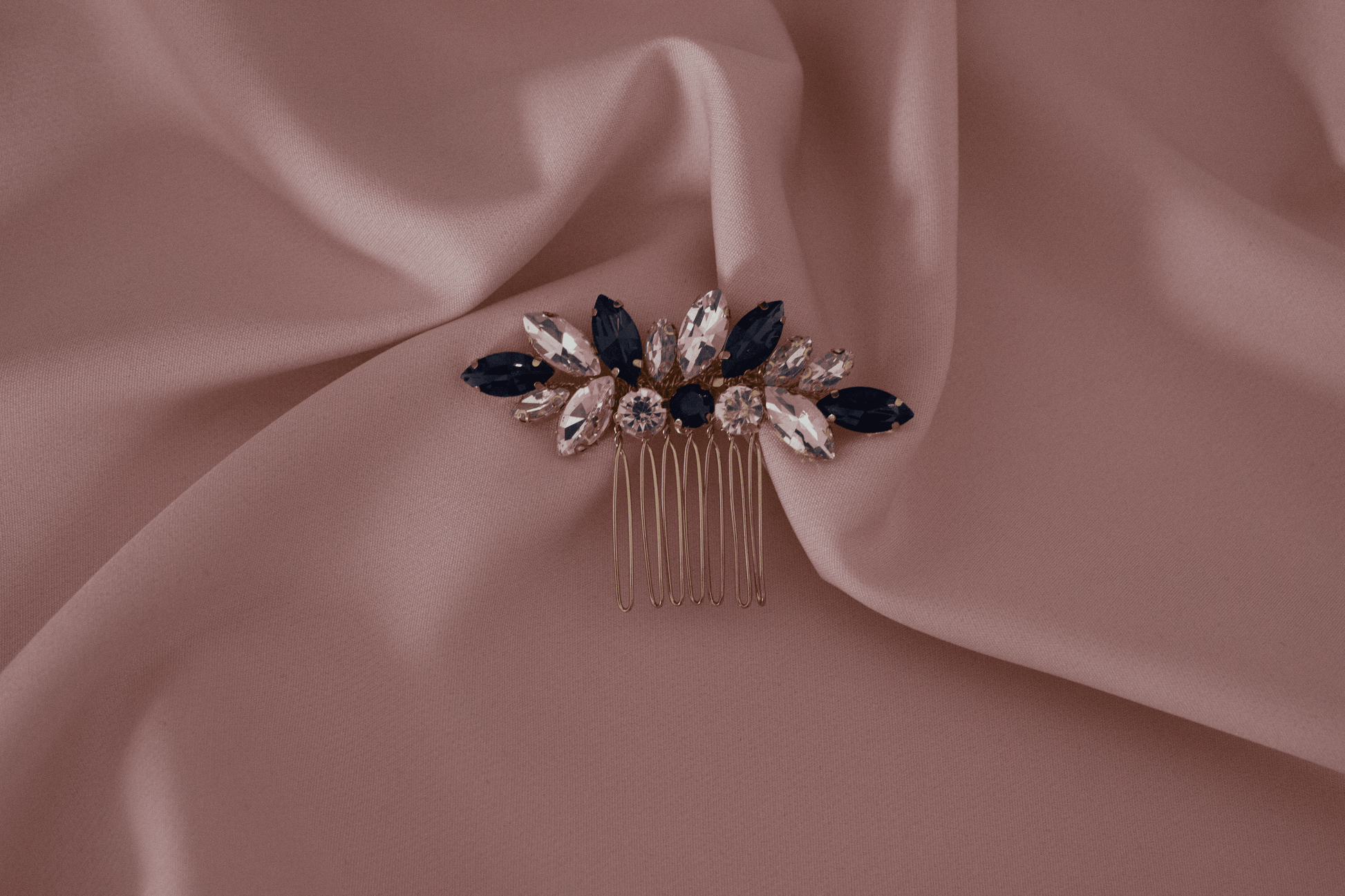 Haarkamm mit der Grundfarbe Gold, die Steine sind in der Farbe Weiß/Blau.