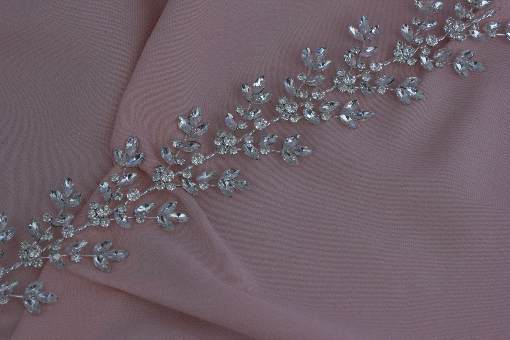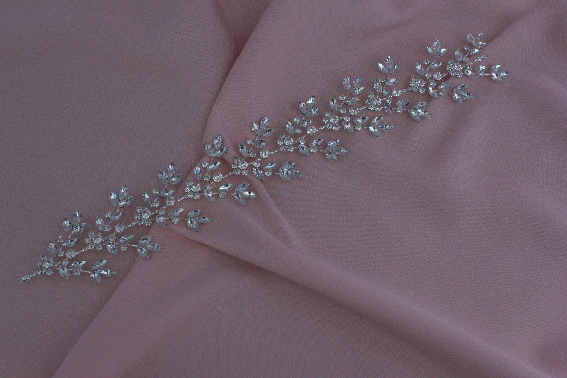 „Yar“, ein wunderschöner langer Haarschmuck, der mit blattförmigen Steinen verziert ist und deren mittlerer Reihe ein florales Aussehen verleiht.