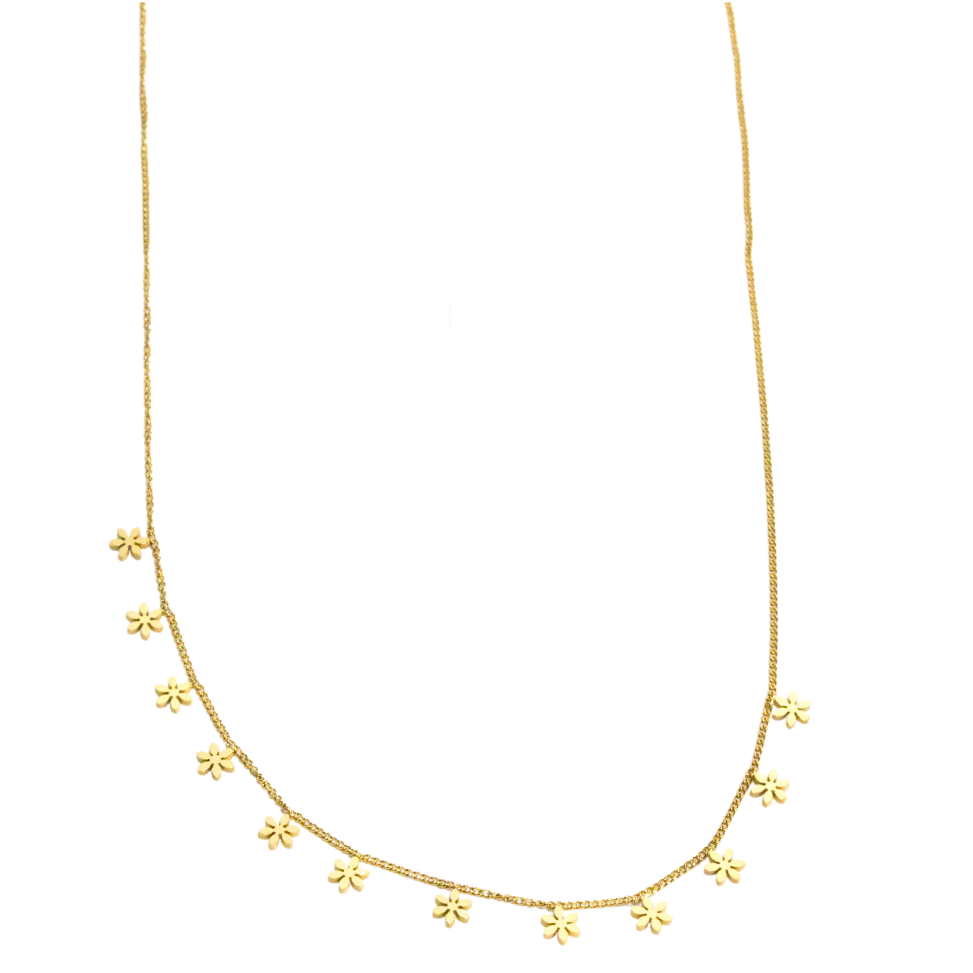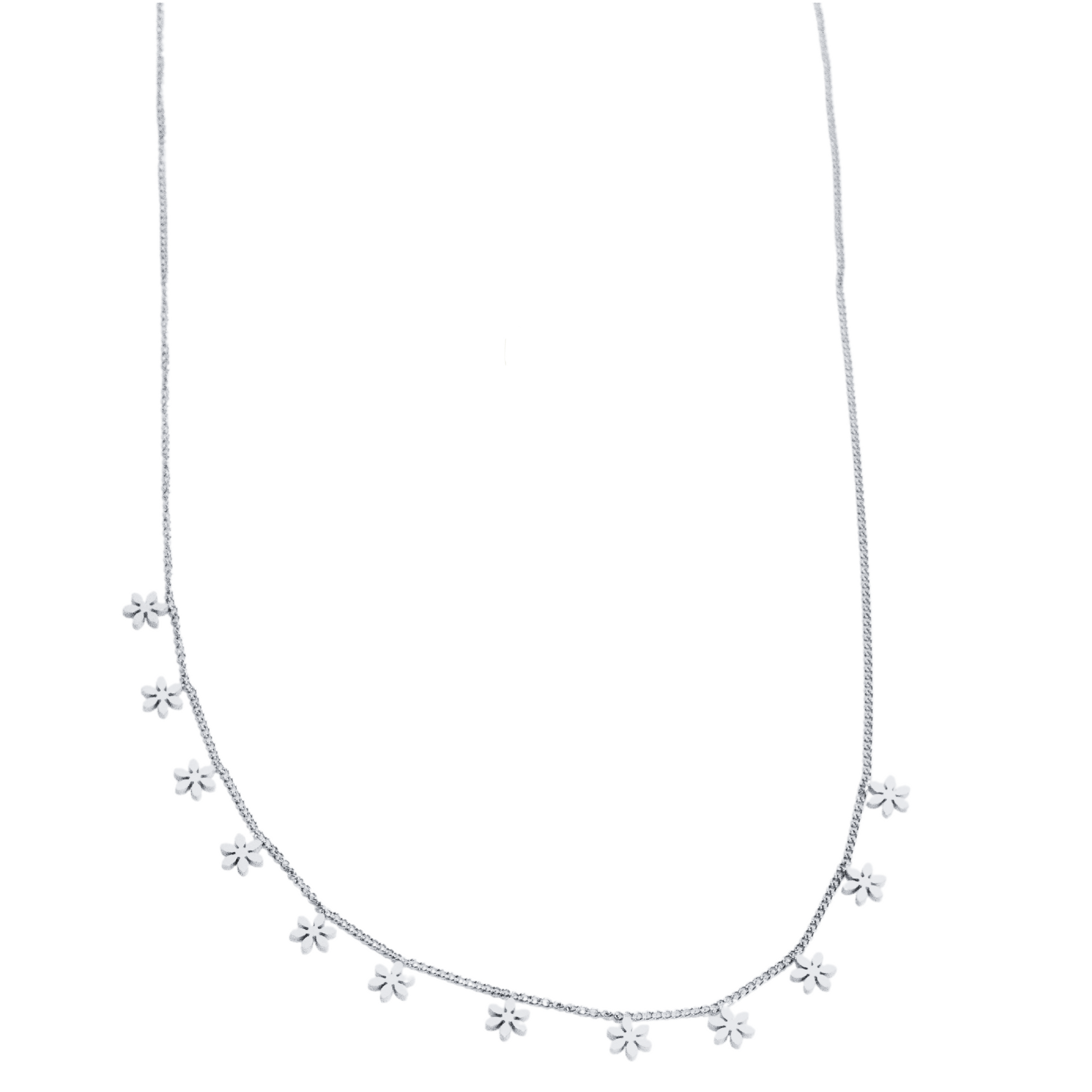 Die sorgfältig um die Kette platzierten kleinen runden Blumenanhänger erzeugen ein zartes Muster, das die Blicke auf sich zieht, ohne übertrieben zu wirken. Jeder Anhänger ist ein Meisterwerk für sich und verleiht der Halskette einen einzigartigen Charakter.