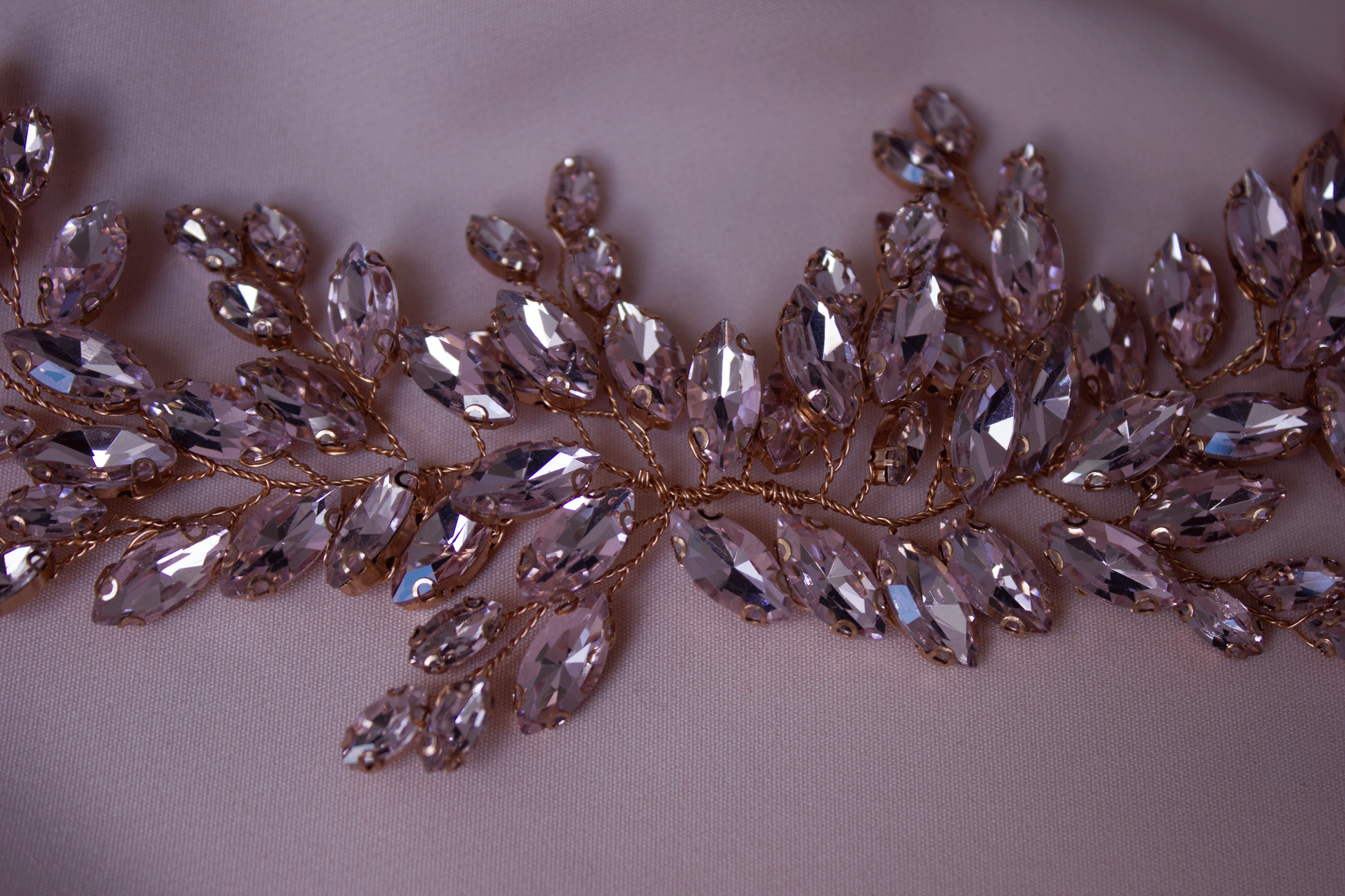 Hair jewelry with the base color rose gold, the stones are in pink. This hair jewelry can be used with almost any hair style thanks to the flexibility of the iron wire.