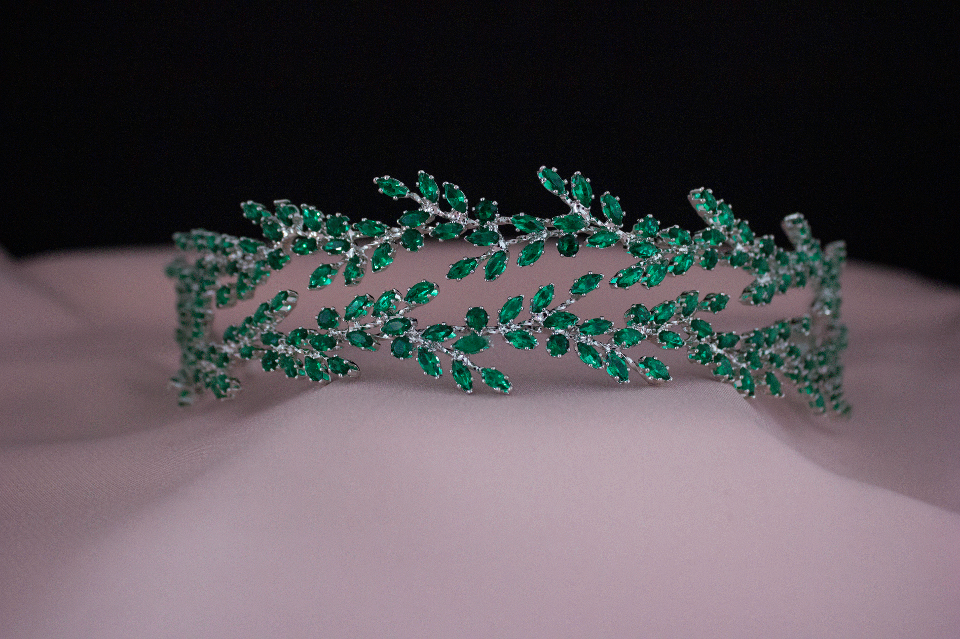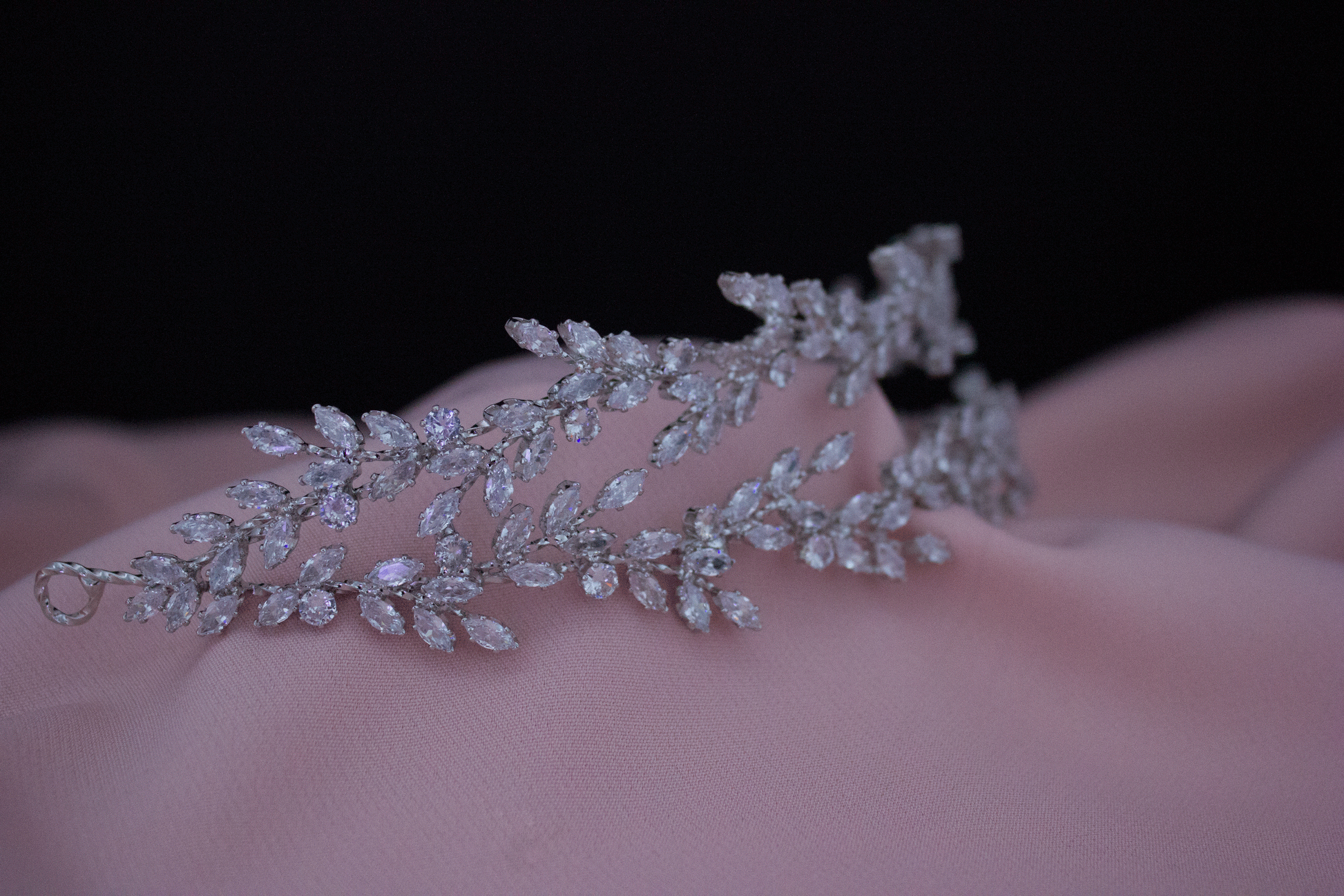 De diadeem bestaat uit twee lagen die zachtjes over elkaar heen buigen, waardoor een gelaagd effect ontstaat dat het haar van de drager op een sierlijke manier omlijst. Het basisframe van de diadeem is vervaardigd van duurzaam en glanzend metaal, dat licht reflecteert en een subtiele glans toevoegt aan het geheel.