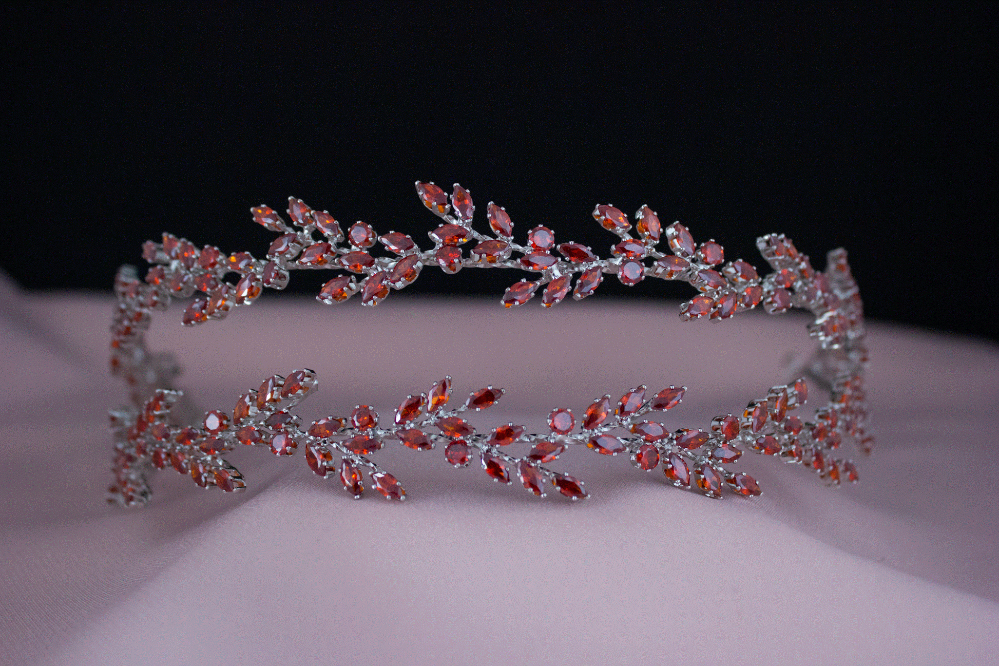 Alma, een elegante 2 lagen haarsieraad dat volledig is bewerkt met zirconia stenen. Onze ''Alma'' haarsieraad is verkrijgbaar in 3 kleuren: Zilver, Rood en Groen.
