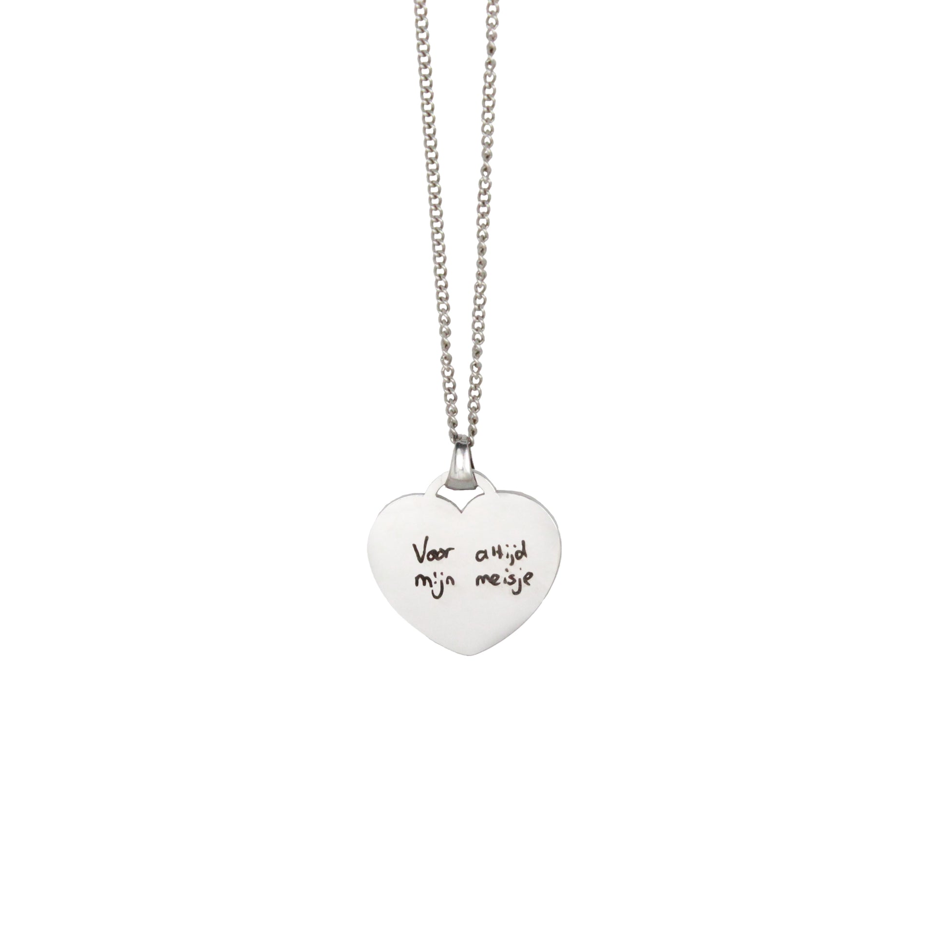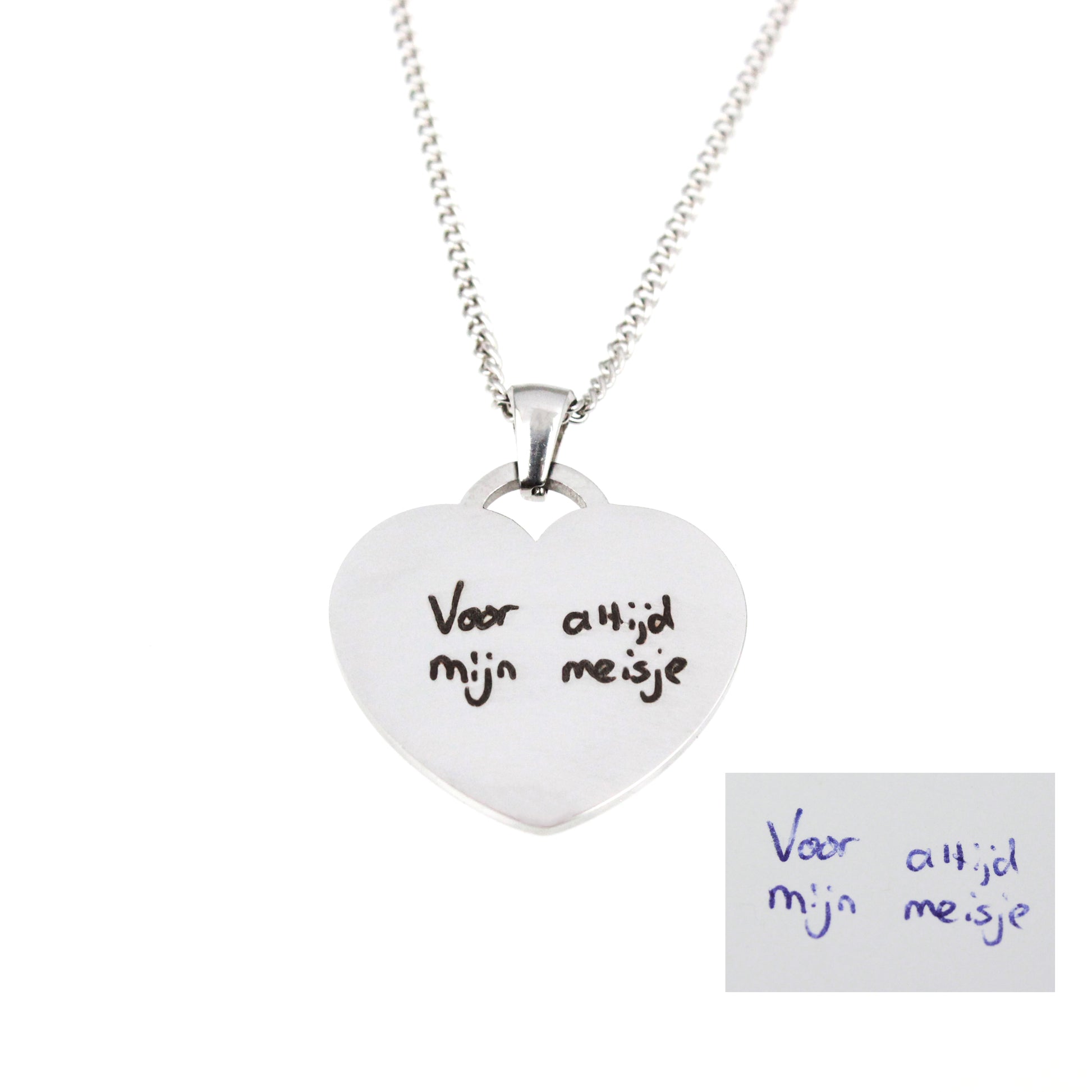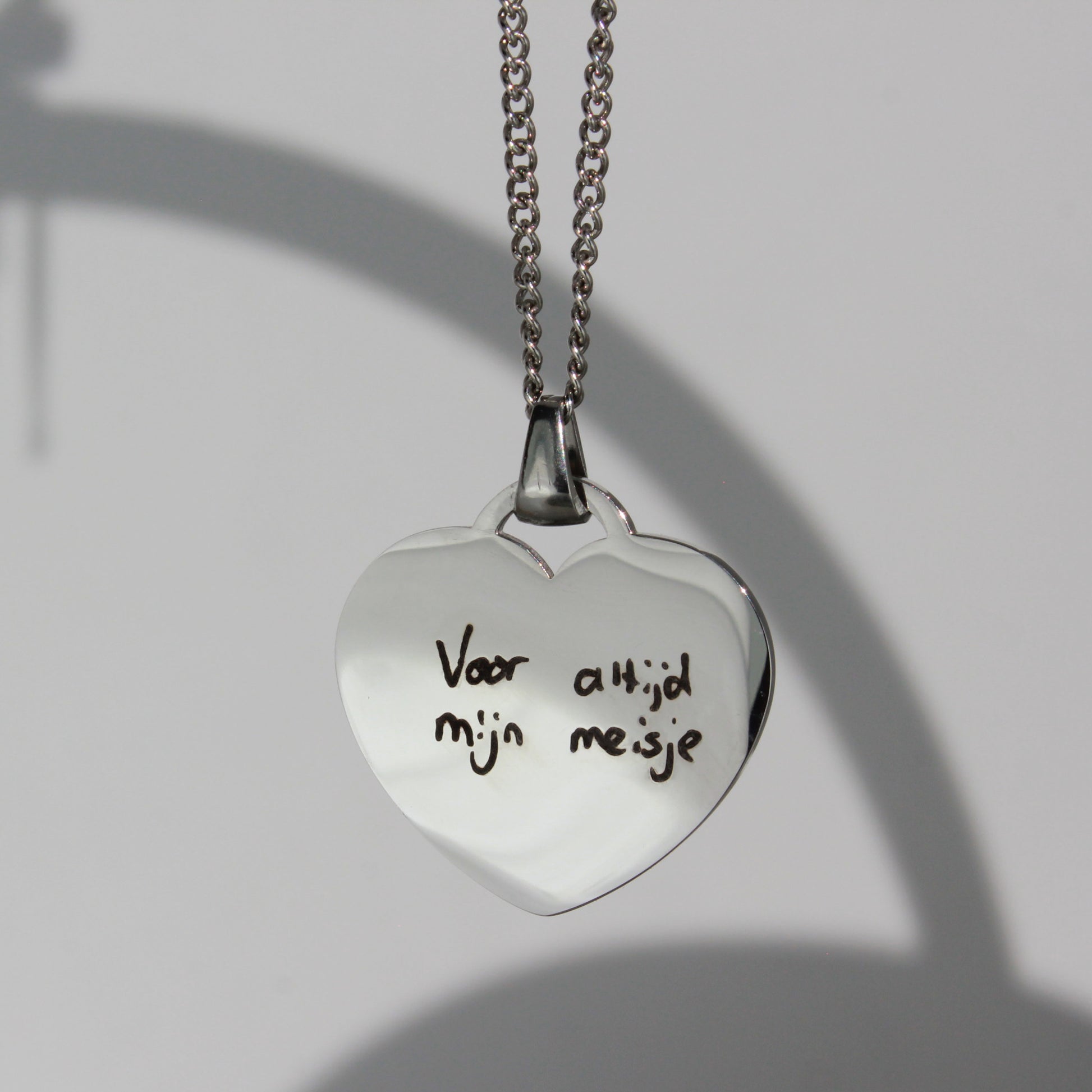 Verbondenheid is het hart van liefde, en onze hoogwaardige zilverkleurige ketting met een prachtige hartenhanger, gepersonaliseerd met de handschrift van je geliefde, is het perfecte symbool van deze diepe connectie.