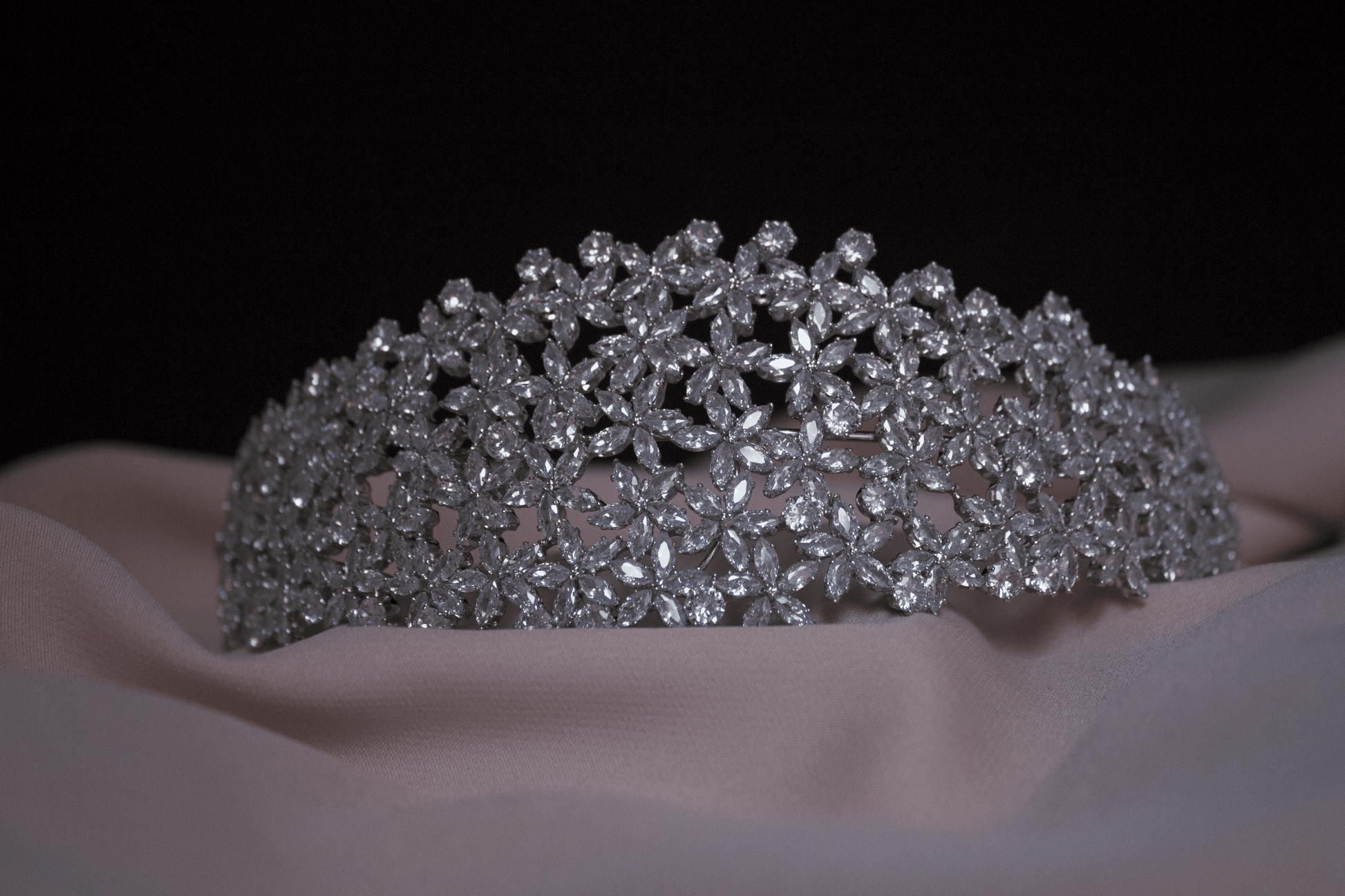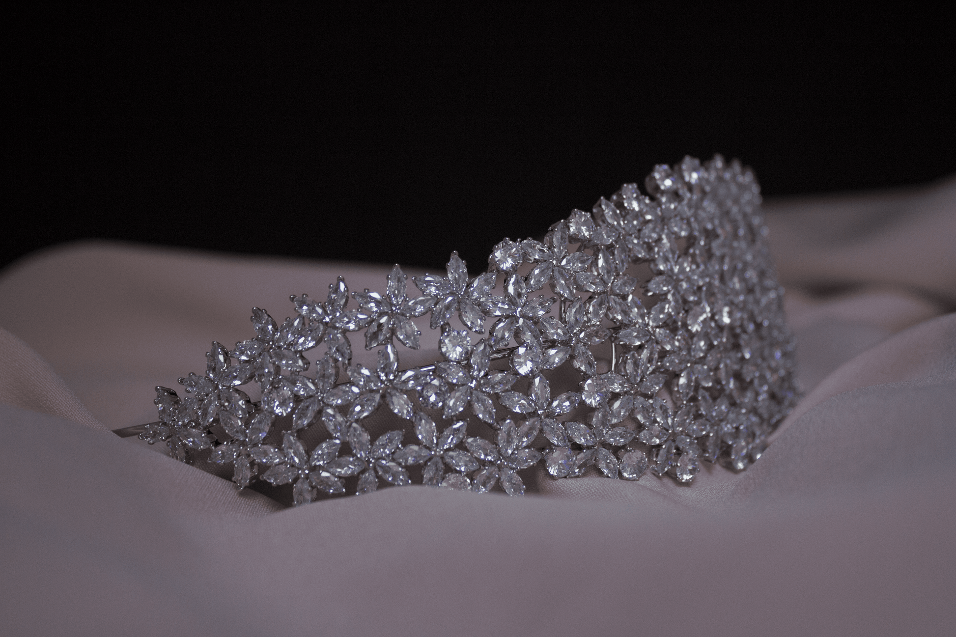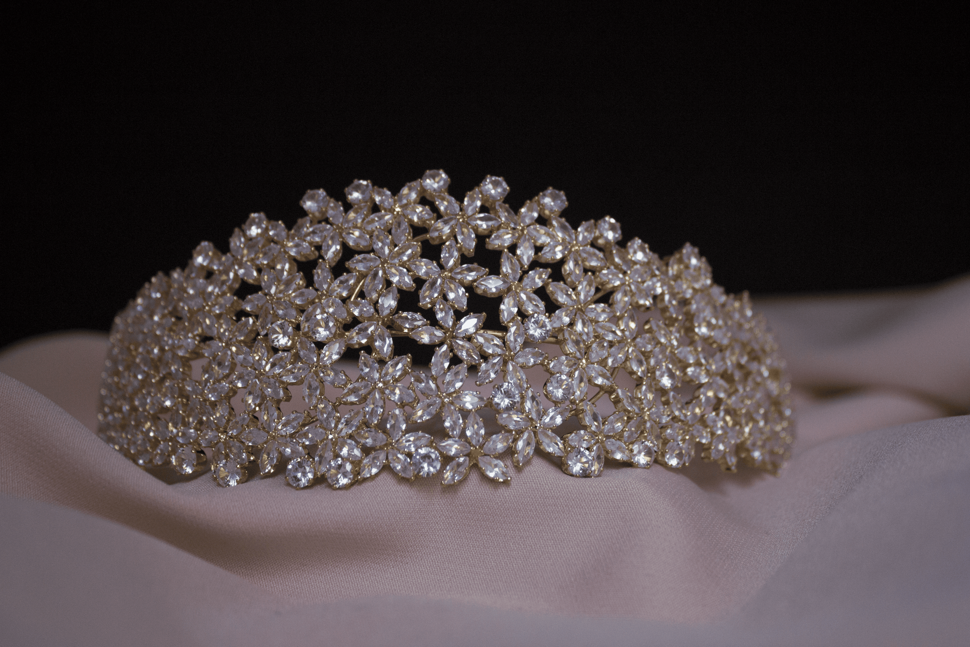 De kristallen stenen, variërend in vormen, voegen een dynamisch en eigentijds element toe aan de haarband. Van klassieke ronde tot opvallende princess cuts, deze variatie in stenen creëert een subtiel spel van schittering en glans.